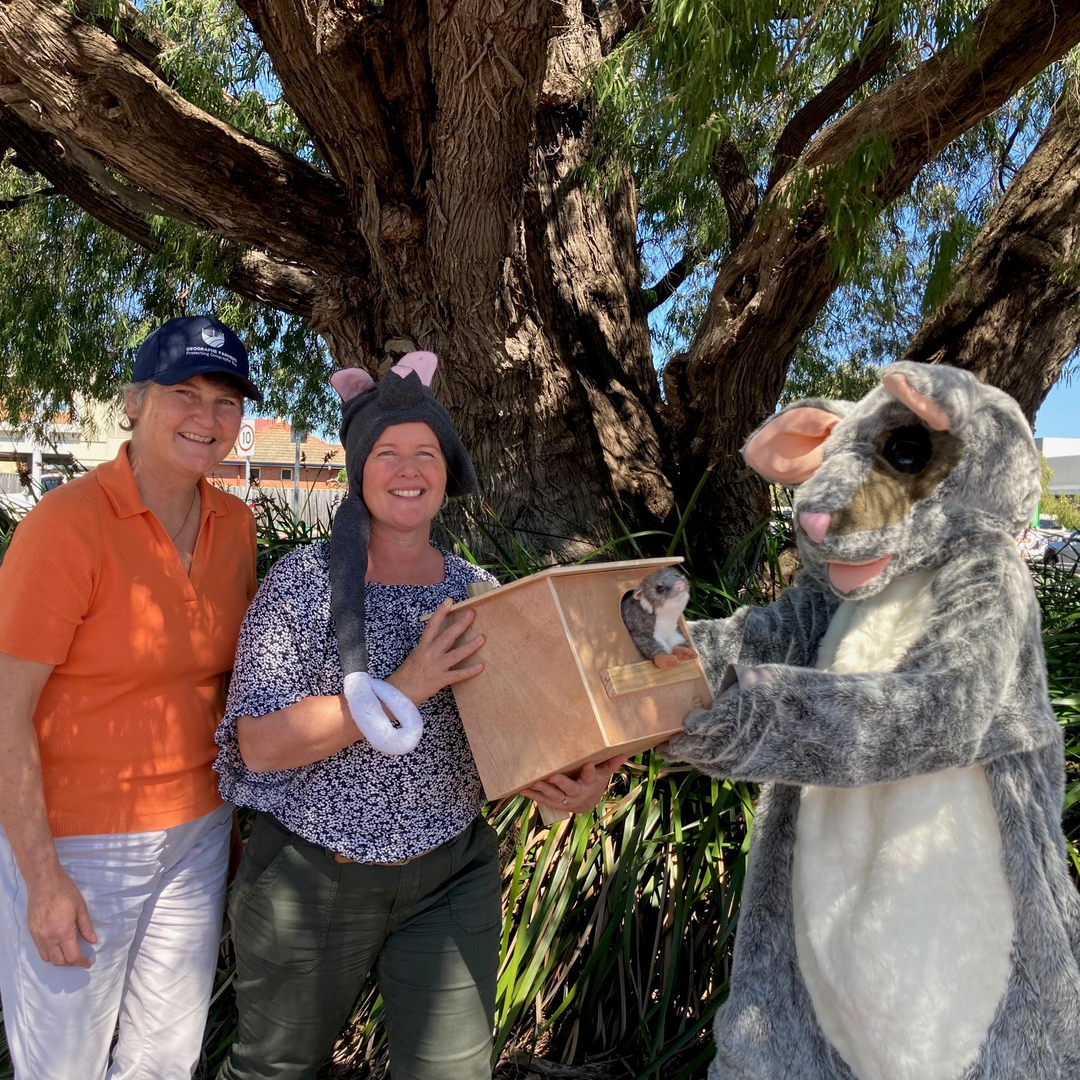 Harriet Wyatt and Nicole Lincoln from GeoCatch with Western the Ringtail Possum inspecting a possum box produced by Busselton Mens Shed. Picture supplied.