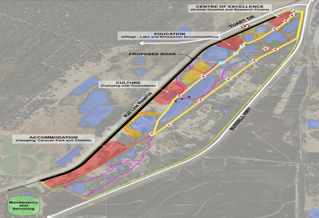 They have earmarked a 319 Hectare area between Tuart Drive and the Bussell Highway – the rehabilitated former site of an Iluka mineral sands mine – to establish an intergrated eco-tourism and indigenous culture attraction, native animal hospital, and research facility.