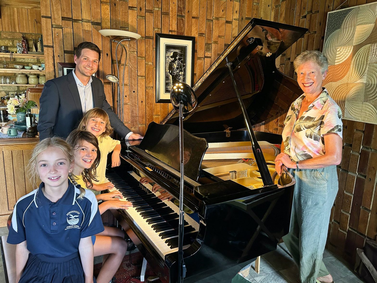 Piano students Kira Pietrzak, Charlie Olszewski, Quinn Hadley, educator Phil Watts and piano teacher Ros Happ are looking forward to being able to perform on a quality piano at Saltwater Busselton.