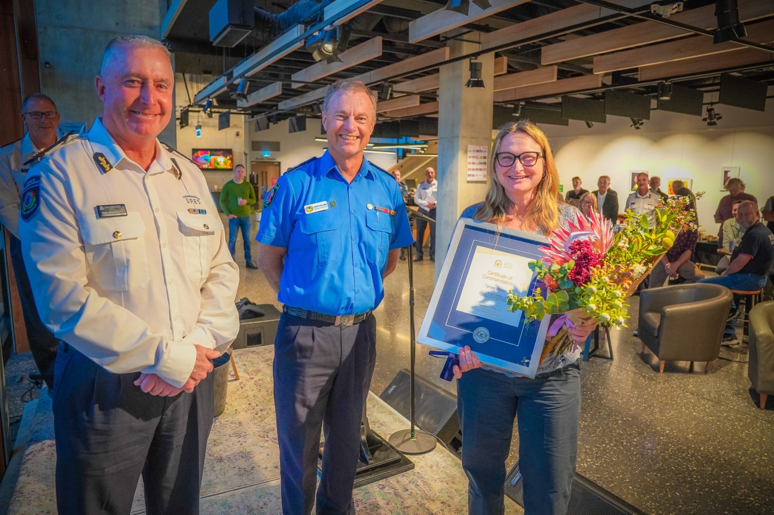 DFES Superintendent Phil Brandrett presented a Certificate of Commendation – the highest DFES award for service of meritorious nature and outstanding actions – to the Volunteer firefighter for her bravery and dedication in providing lifesaving first aid to a 25-year-old French man, in the midst of a fire.