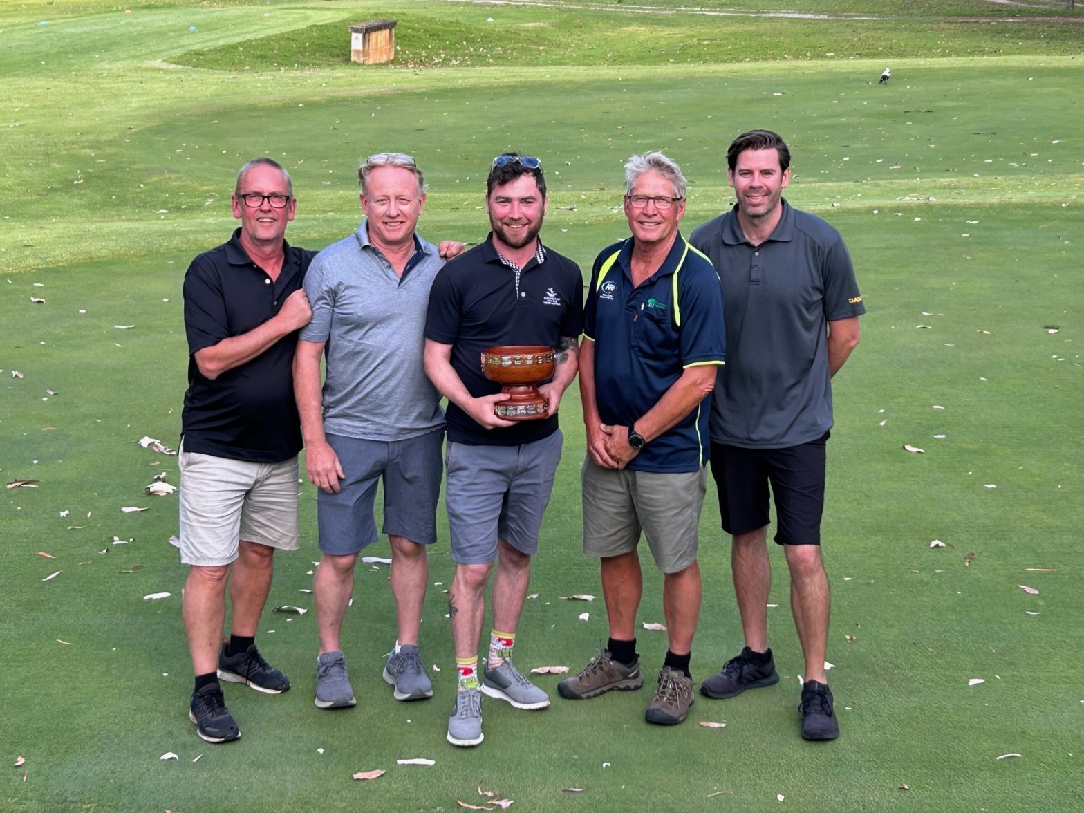 Scroungers Cup 2023 winner Cris Mitchell (centre) flanked by Cowaramup Agencies' Tim Hallyburton and Neil Earl, with Margaret River Golf Club Captain Mick Herbert and Davey's Aidan Gregan. Pictures supplied.