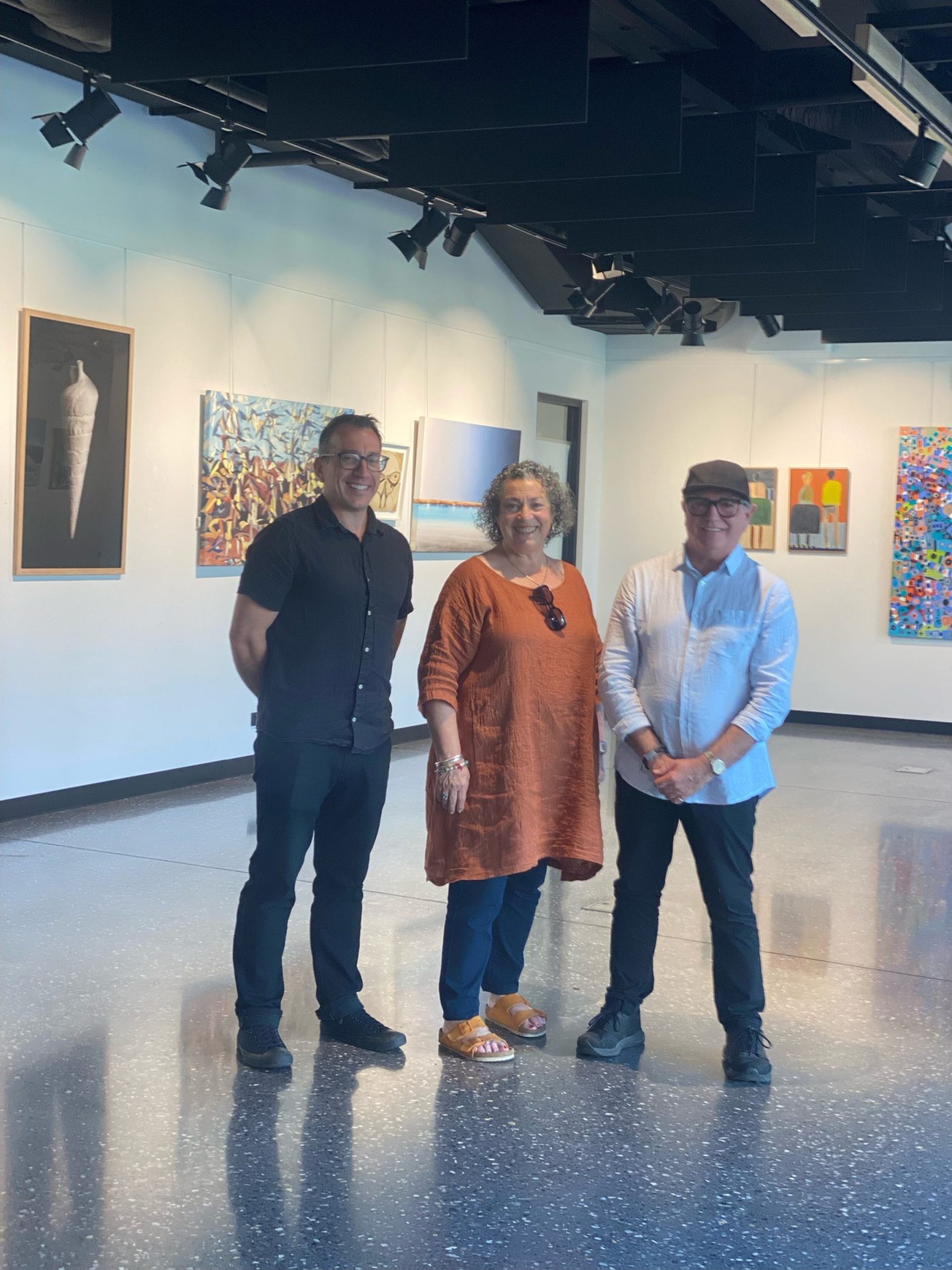 Bunbury Regional Art Gallery Director Dr Michael Bianco, and local artists Paula Cristoffanini and Shaun Atkinson at the Margaret River HEART last week. Picture supplied.