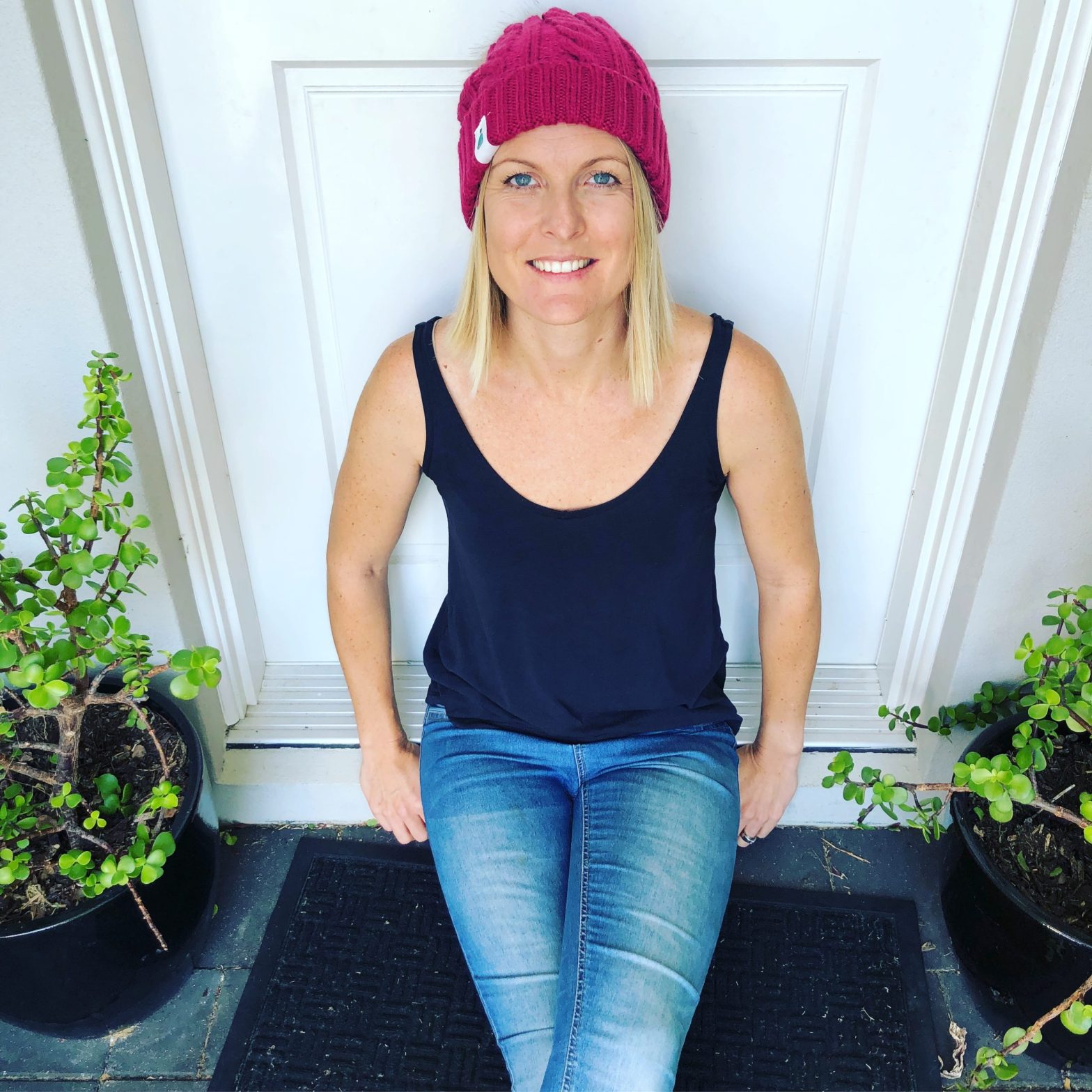 Dunsborough resident and brain cancer survivor Tara Hawken wearing a Carrie's Beanies 4 Brain Cancer beanie. Image supplied.