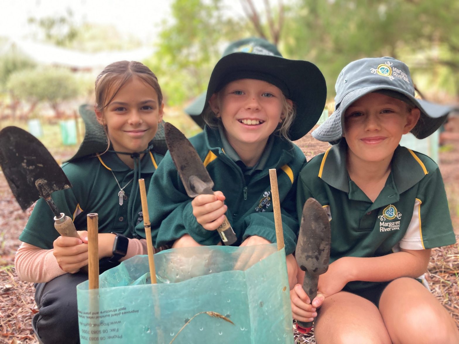 Recently three classes from Margaret River Primary School got their hands dirty along the River by planting, staking and bagging native trees and shrubs, and removing weeds to give the seedlings the best chance of thriving.