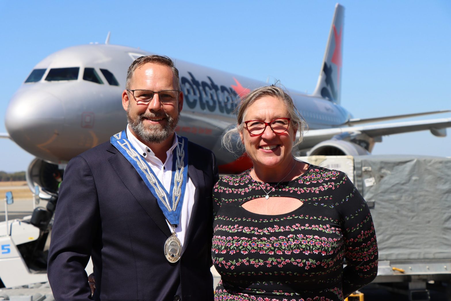 City of Busselton Mayor Phill Cronin and Warren-Blackwood MLA Jane Kelsbie at the Busselton Margaret River Regional Airport for the arrival of the first Jetstar Sydney flight. Picture supplied.