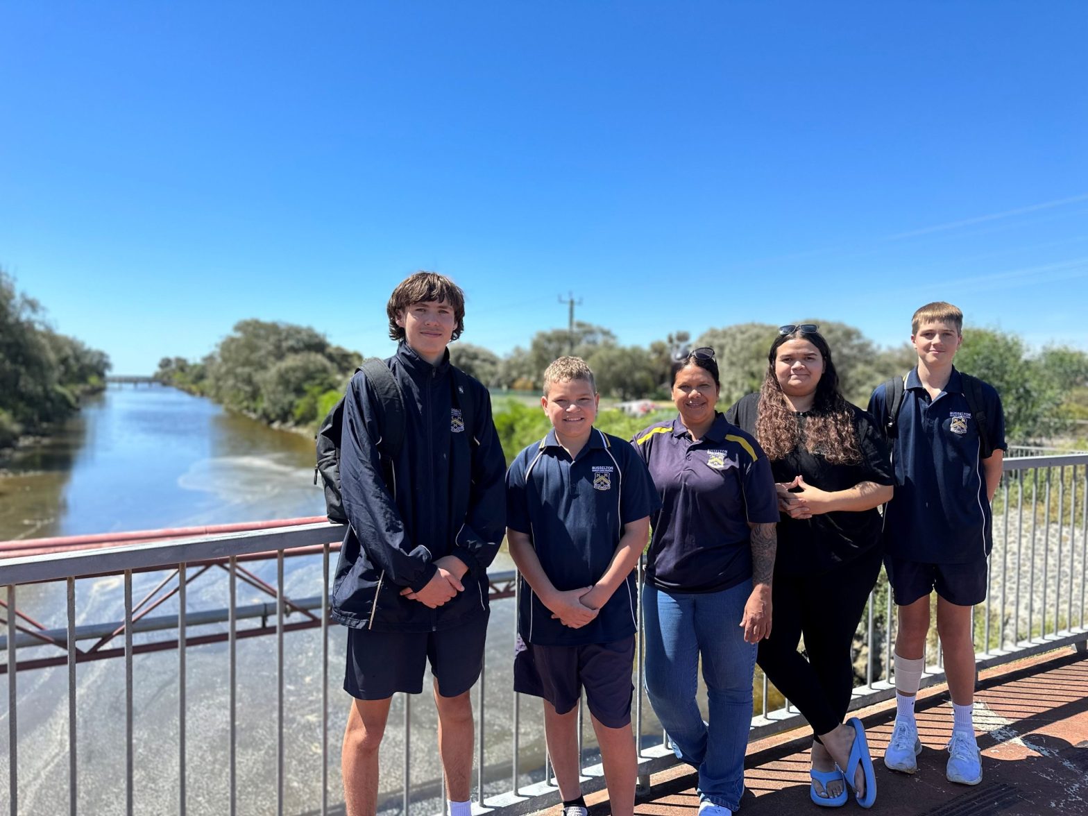 Students from Busselton High Schools Waalitj Kaaditjin Academy Darcy Anderson, Dailen Sanderson and Jai Spinks with their teacher Gwendoline Gray and artist Mariah Yarran.